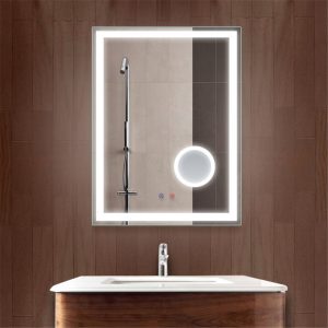 | Features | 1. 3-color changeable, LED light is dimmable with memory function 2. Smart touch sensor switch 3. Anti-fog function 4. With magnifier 5. Customized function : Bluetooth speaker: play music and answer the phone while makeup; LED clock and temperature display function |