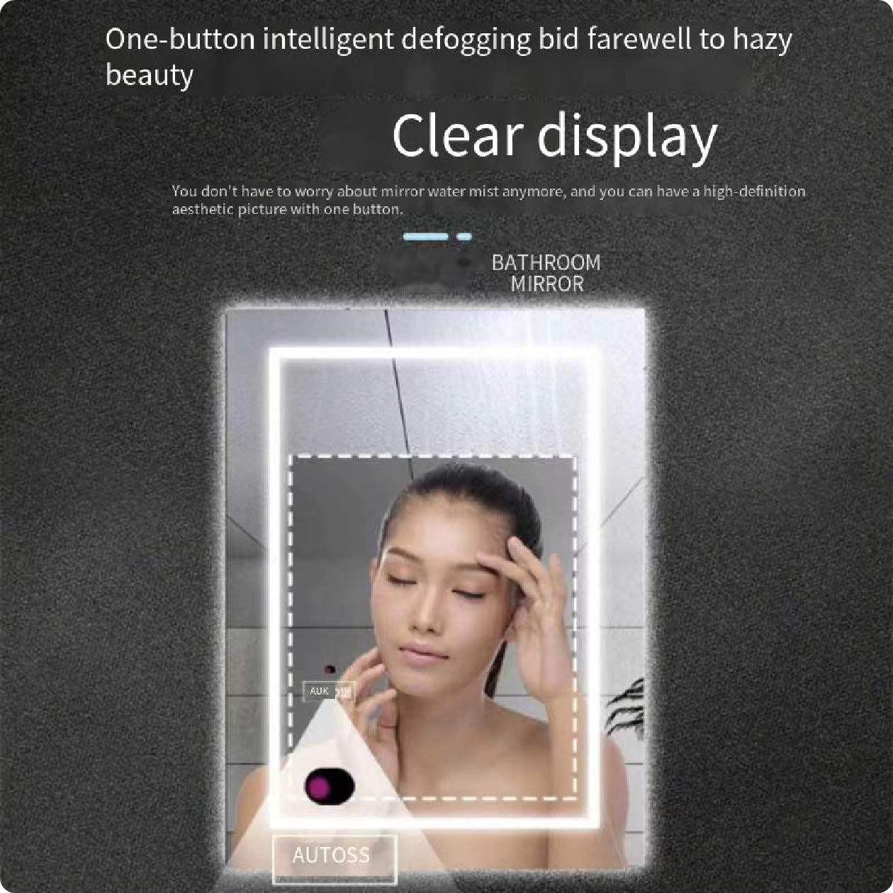 Modern wall-mounted Bluetooth smart LED vanity mirror with anti-fog technology and hidden lighting, ideal for hotels, villas, and luxury bathrooms.
